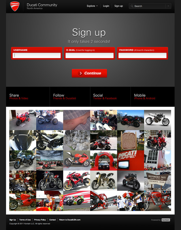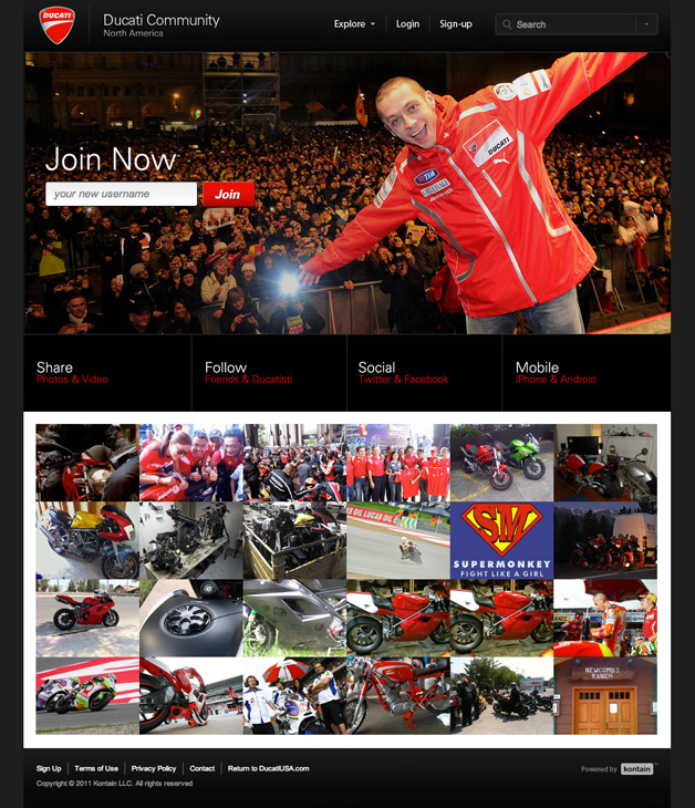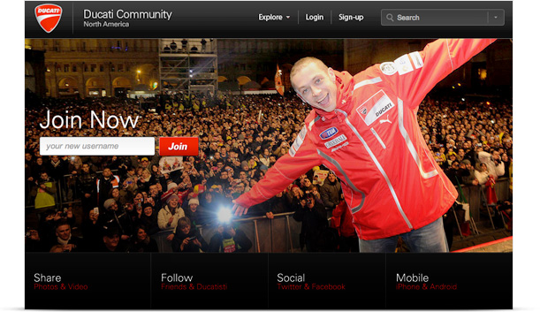 The gorgeous Ducati Community boasts a rich homepage of editorial and featured user content including "call to actions" for specific campaigns. The Ducati community is the centerpiece in the social strategy for the Italian brand.