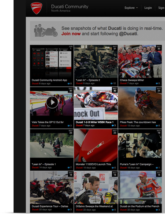 New fans are greeted by a stream of of the latest content from Ducati and their users. Anyone can browse - no sign-in required!