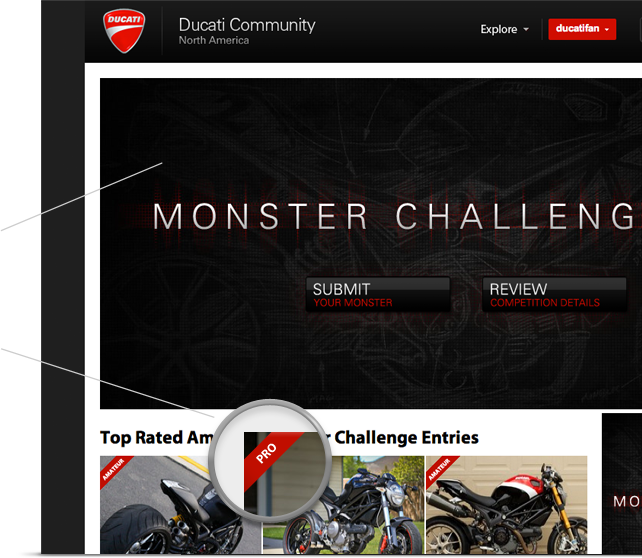 To complement Ducati's Monster Challenge campaign, we added a voting system for those specific entires where users could vote on entries which where then ranked and featured.
